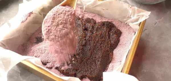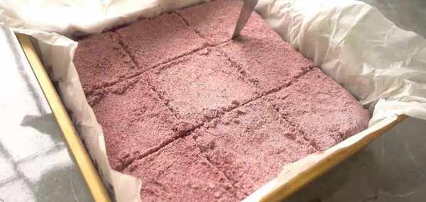 篩好之後把其中一半的粉末倒進模具中,鋪平,放入一層紅豆沙。