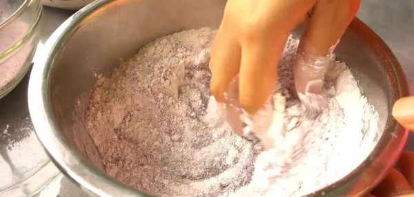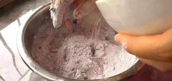 一點一點地加入清水,捏散,不要讓粉末凝成團。紫米粉的話你可以通過網購的方式購買,也可以自己用紫米研磨成粉末。我就是自己在傢用料理機磨粉的。