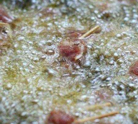 炸約三分鐘左右,肉串表面變色、呈微焦狀撈出