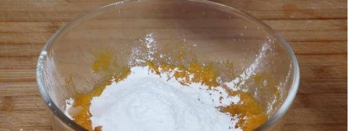 3、南瓜放在大碗中之後咱們用搟面杖將其搗成泥,然後把準備好的10克白糖放進去,將它們攪拌均勻,白糖要趁熱加進去,這樣可以加快白糖融化,然後再在碗中加上200克糯米面,將它們攪拌成絮狀,攪好之後先下手揉一下。