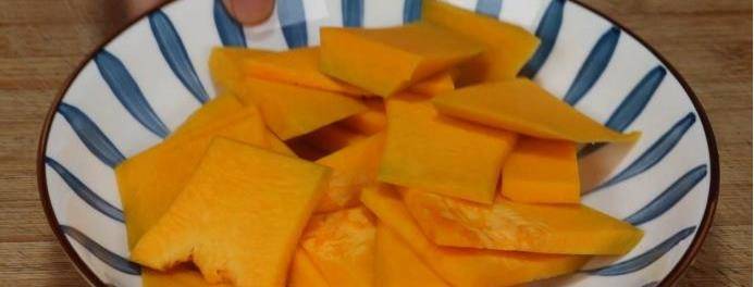 2、先將咱們準備好的南瓜取出來,將南瓜先清洗一下,清洗完瞭之後放到案板上,再將它的外皮全部切去,切完外皮之後咱們再將南瓜切成片,切完的南瓜片直接放到一個盤中,然後冷水上蒸鍋,用大火蒸20分鐘,20分鐘之後南瓜就已經被完全蒸熟瞭,這個時候咱們要準備一個大碗,將南瓜片全部倒入到大碗中。