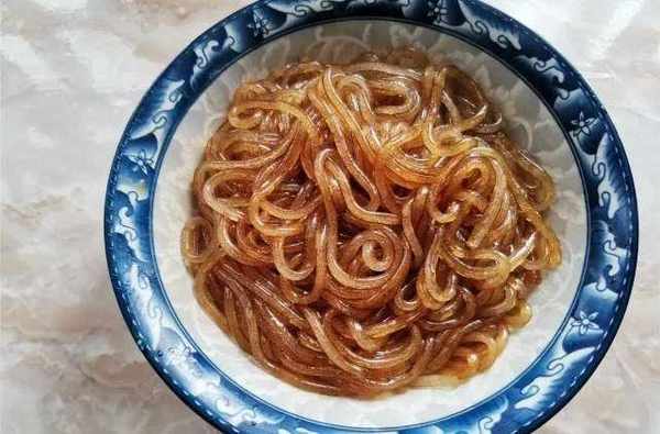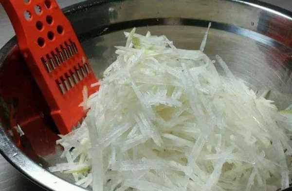 1.首先紅薯粉條一小把放在溫水中給它浸泡半小時,然後再準備新鮮的白蘿卜一根。去掉外皮,先給它切成厚厚的薄片,最後切成細絲放入碗中備用。