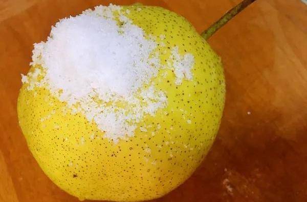 1.首先準備新鮮的黃皮雪梨一個,把它放在清水中沖洗一遍。然後在上面撒上一小把精鹽,用手按摩五分鐘。放在清水中,再次清洗一遍。就可以啦。