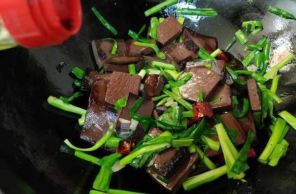 3.加入調味料之後可以用鍋鏟輕輕的翻動幾下,讓豬血煮個兩分鐘左右,就可以把韭菜放下去瞭,韭菜放進去之後輕輕翻炒,把食材炒至斷生就可以出鍋瞭,簡單又美味。