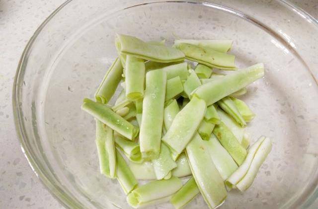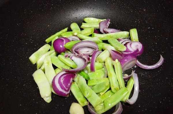 四、鍋燒熱倒入適量的油,平時炒菜量就可以瞭,把豆角、蔥和蒜一起入鍋,小火慢慢煸炒。