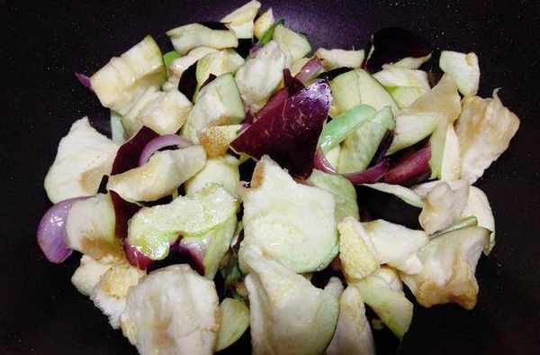 五、豆角斷生後就可以放入茄子塊瞭,繼續中小火慢慢翻炒。因為提前浸泡過水,所以茄子基本上也不會吸油瞭。