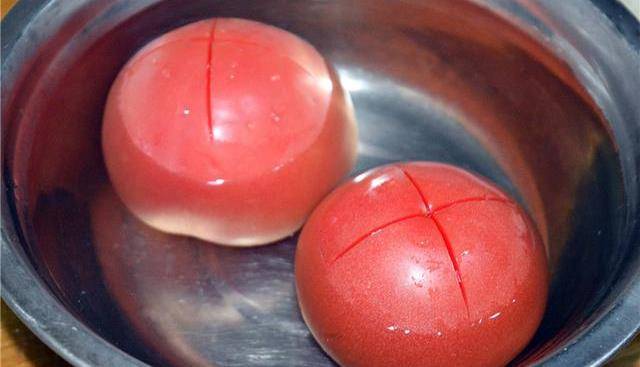 1、準備好所需要的食材,在西紅柿頂部用刀劃十字,放在大一點的容器中,鍋中倒入適量的清水,大火燒開後,澆在西紅柿上面,讓西紅柿在熱水中浸泡一分鐘左右。然後用手輕輕撕掉西紅柿的外皮。