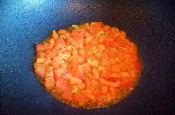 3、起鍋,鍋中倒入適量的食用油,油熱後放入切好的蒜末煸炒出香味,接著放入切好的西紅柿丁,開中火炒至西紅柿軟爛。