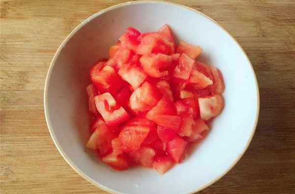 2、西紅柿去皮後,用刀切成小丁放入盤中備用。嫩豆腐用清水沖洗幹凈,然後用刀切成小塊放入盤中備用。大蒜去皮拍散切成蒜末,小蔥清洗幹凈用刀切成蔥花備用。