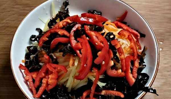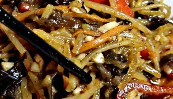 在鍋裡燒開水,加上點食鹽和油,把胡蘿卜絲和土豆絲放進去,焯水2分鐘,然後出鍋過一遍涼水,再把木耳放在鍋裡,焯水1分鐘出鍋,也是過一遍涼水,把木耳、胡蘿卜和土豆上面的水分都擠幹,放在一個碗中,再把紅椒絲、蒜末、花椒粉、辣椒面、淋上熱油,先蓋上蓋子燜2分鐘,時間到加上點食鹽、白糖、生抽、蠔油、香醋、香油攪拌均勻,裝在盤中即可食用。