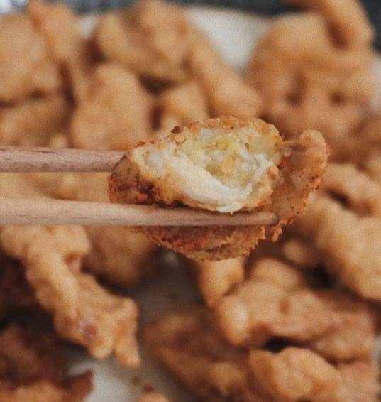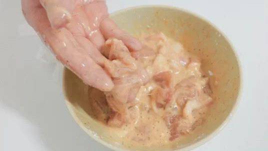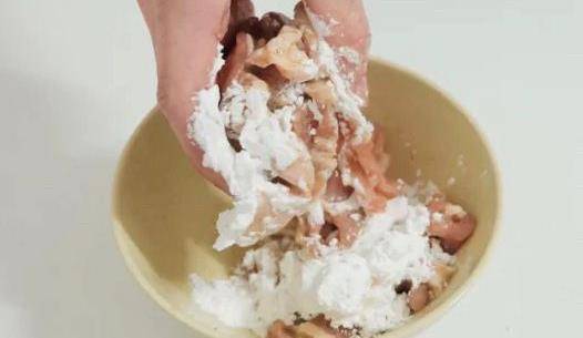 3、直到肉片可以均勻掛滿面糊不掉落,如下圖這種狀態;
