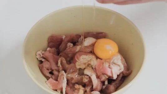 1、五花肉洗幹凈切成厚薄均勻的肉片,放入花椒粉、白胡椒粉、白糖、鹽和料酒,攪拌均勻,醃制半小時,醃制好的豬肉再打入2顆雞蛋攪拌均勻;