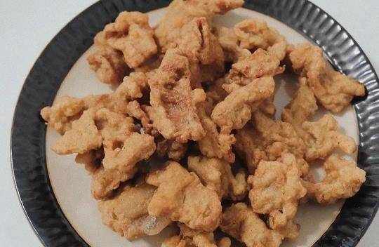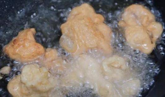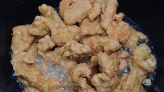 5、然後把肉片再復炸一次,復炸的時候油溫要比第一次炸的更高,油溫再次升高後,我們把全部的肉片都倒進去復炸,肉片榨汁金黃色就可以出鍋瞭。