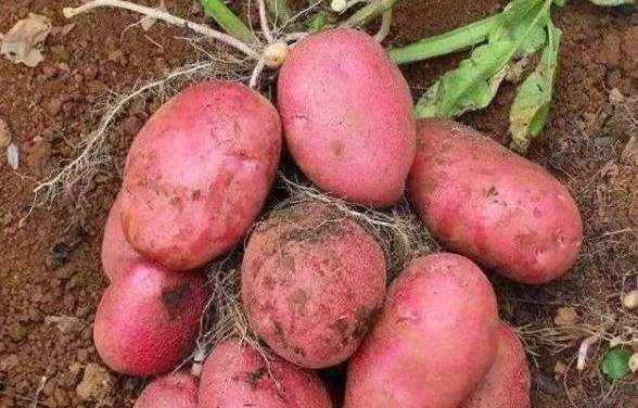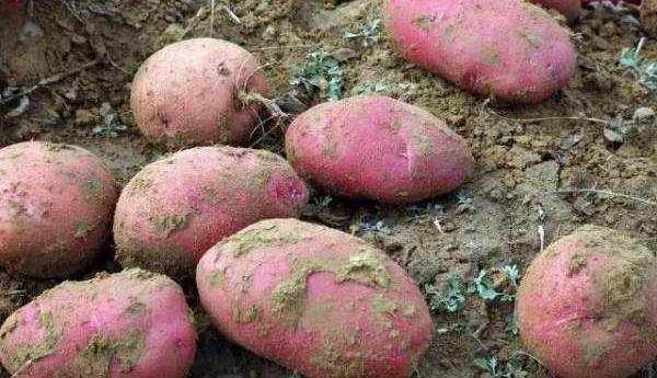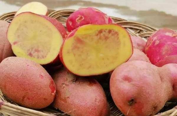 紅皮土豆顏色特別,呈粉紅色,紫紅色不等。富含多種微量元素,尤其高含淀粉和花青素,營養豐富,食療效果極佳。紅皮土豆相對於一般土豆口感更糯、面,汁多有粘性,被評為最適合做土豆泥和薯條的土豆。在營養成分上紅皮土豆遠遠高於常見的普通土豆。例如蛋白質的含量比普通的土豆一倍還高,同時,紅皮土豆富含大量的花青素,而花青素是目前人類發現的最有效的抗氧化劑。具有抵抗自由基,抗衰老的功效。一刀下去,土豆片上泛出的紫紅色清晰可見。