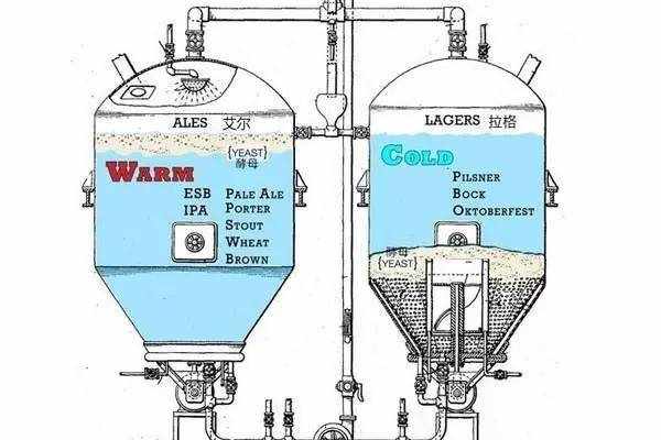 精釀啤酒和工業啤酒的發酵工藝也有所區別,通常精釀啤酒采用的是艾爾工藝(Ale),工業啤酒采用的是拉格工藝(Lager),二者最主要區別是酵母和發酵溫度不同。如圖所示:
