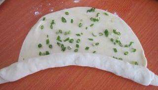 第4部將蔥花切好用熱油潑一下,激發出蔥花中的蔥香味兒。將活好的面團展開成大寶片,然後撒上油鹽,再撒上準備好的蔥花。當然蔥花越多,蔥香味也更加濃鬱。