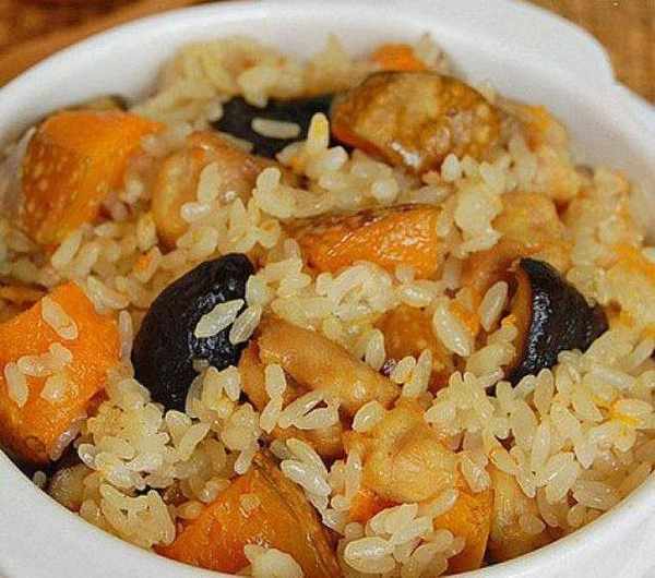 1、南瓜、洋蔥、香菇切成丁。雞腿斬小塊後加料酒、醬油、食鹽、生薑醃制10分鐘,大米淘洗幹凈。
