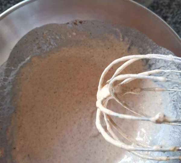 第7步、邊倒邊攪成不連續滴落的較濃稠面糊。