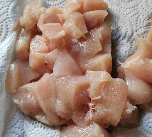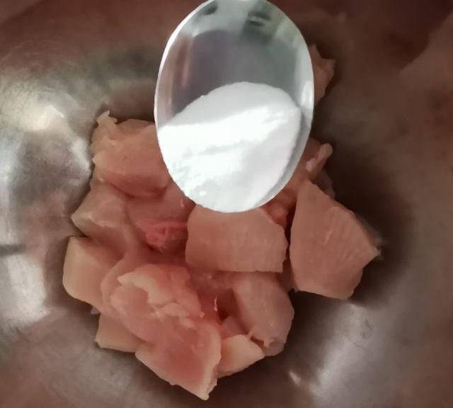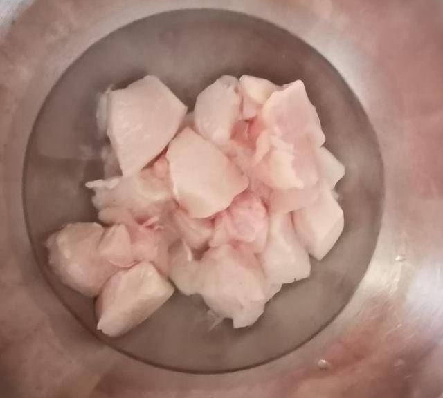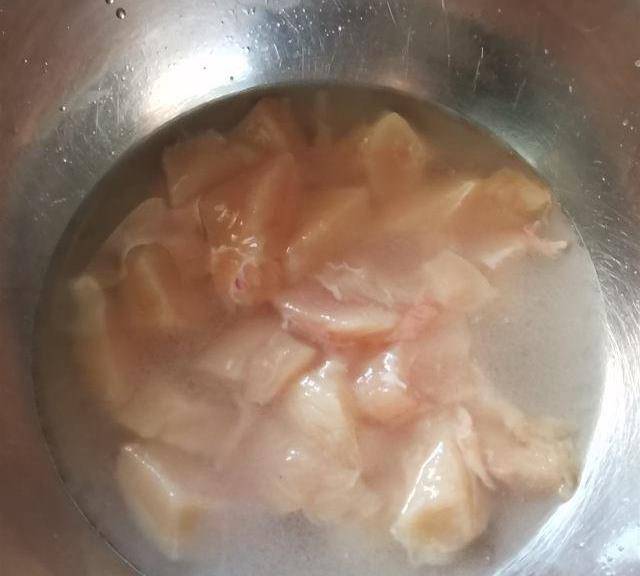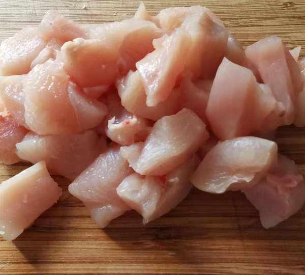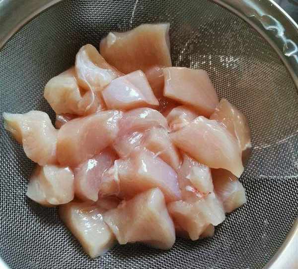 第1步、雞肉切成2厘米大小的薄片。