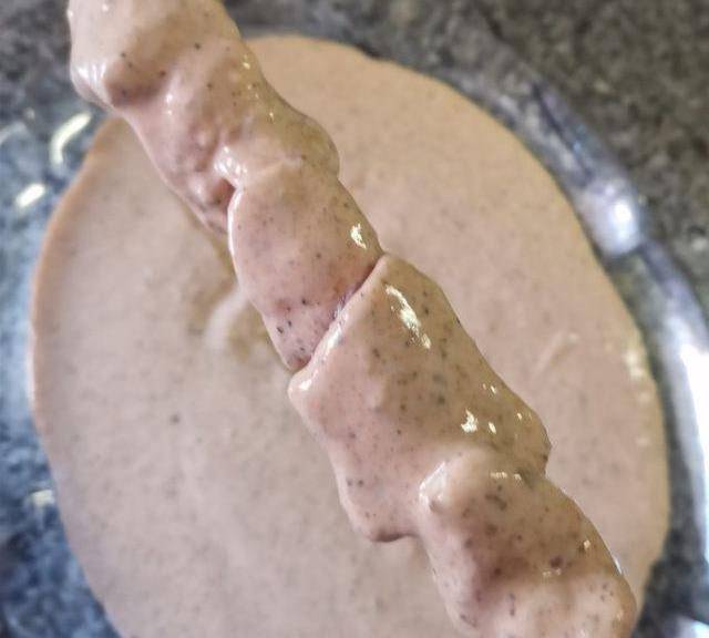 第14步、面糊倒入另個平盤。肉串均勻裹上面糊。