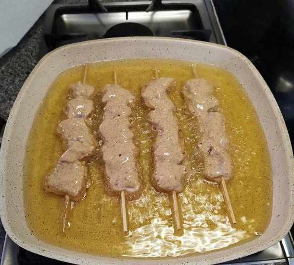 第15步、事前起一鍋熱油,燒至下筷子可快速起小泡,下肉串。