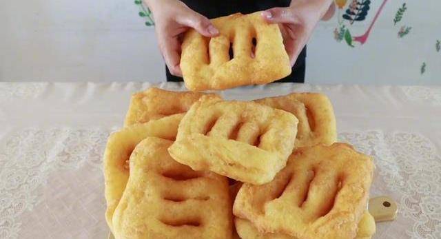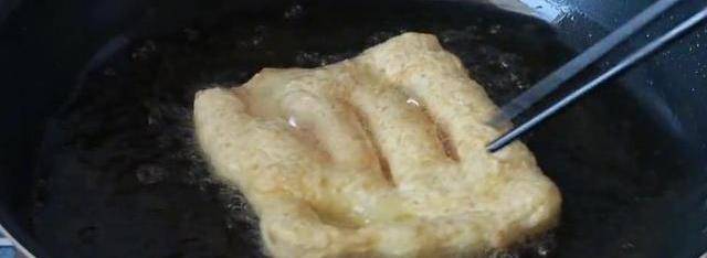 看這個面,特別的柔軟,然後把它整理一下,整理成長條狀,切成大小、均等的面積,切好的面積直接按壓扁,按寬、按扁,不需要搟面杖,也不要按壓的太薄,這樣就可以瞭。然後我們在中間給他劃幾刀,這樣切一個劑子,做一個不需要提前做出來,因為面太粘瞭。鍋中放油,油溫七成熱,下入生坯。
