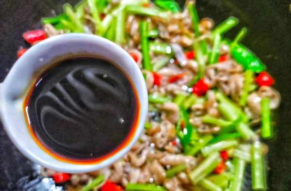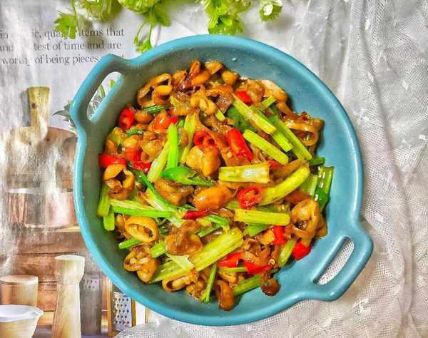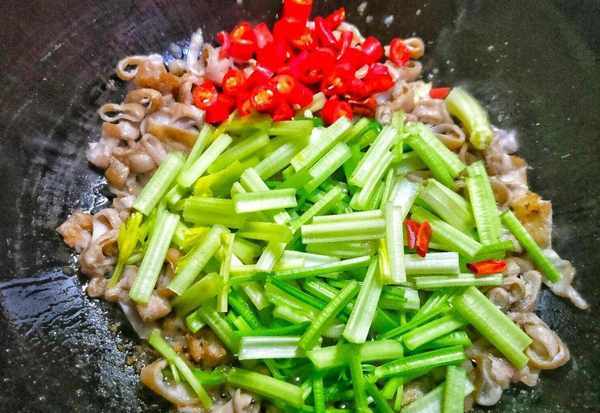 6、此時把切好的辣椒和芹菜段也倒進鍋中,翻炒至芹菜斷生即可。