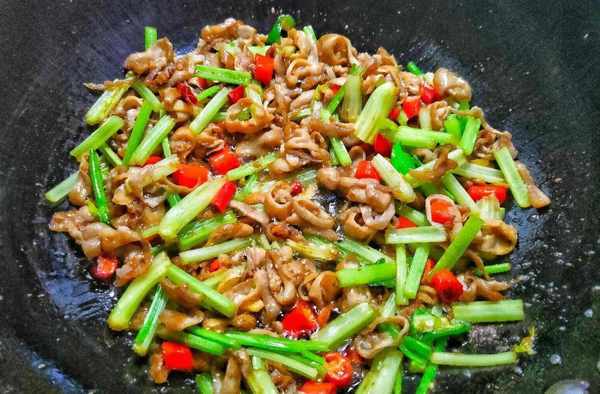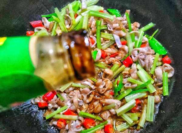 4、肥腸下鍋後多翻炒一會,直至肥腸中的油脂被煸炒出來即可,這樣肥腸就不會膩口瞭。