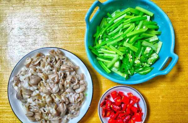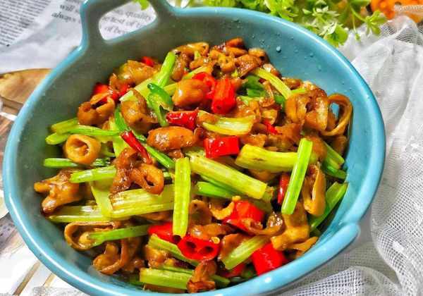 2、肥腸壓好後撈出過涼,這樣可以讓肥腸的口感更勁道,過涼後的肥腸切成小段,再把紅辣椒和芹菜也洗凈切好。