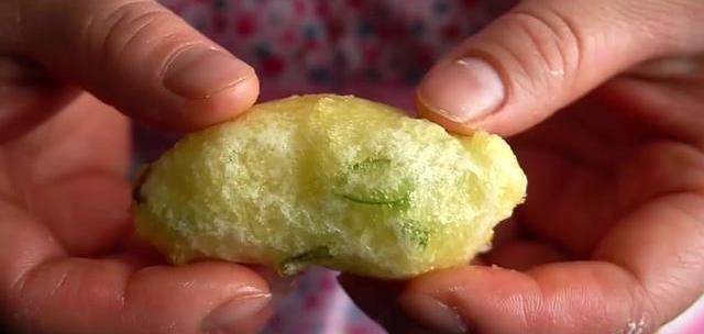 翻個面,防止水分流失。全程用瞭三分鐘的時間。看上去是不是很可愛,有點像小魚兒。泡泡餅裡面松軟鮮香,還保持瞭蔥花的翠綠,喜歡嘗試一下。