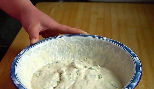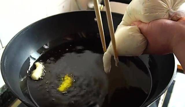 面糊已經發好瞭,倒入提前切好的蔥花,再給它充分地攪拌均勻,二次醒發5分鐘,把口給它捏結實。從袋子的一角剪上約0.5厘米的小口,油溫六七成熱時面團浮起,右手拿一雙筷子方便給它切斷。