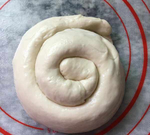 從一頭卷向另一頭,結合處捏實,用手捋長排出多餘空氣,盤成一卷,收尾處捏合。