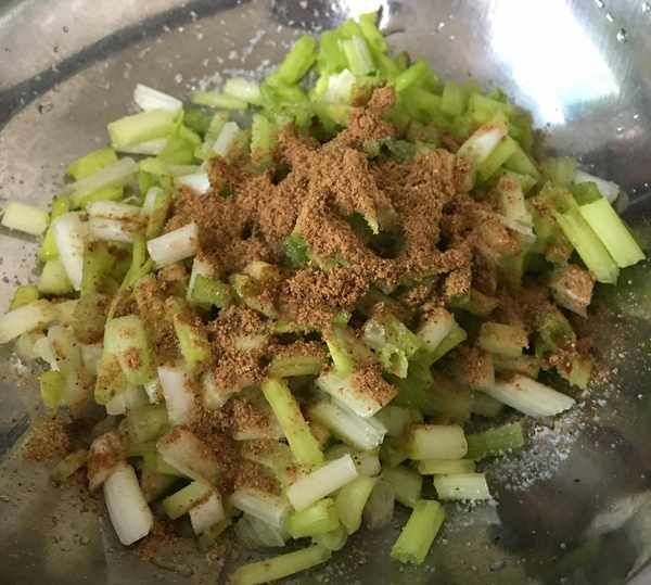 另切一些小蔥,並撒入適量鹽,五香粉,澆入燒熱的蔥油並拌勻。
