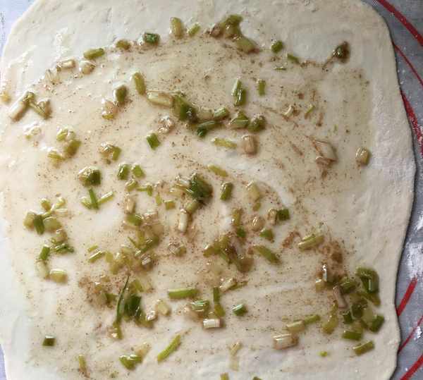 第三步,面團發好後,揉面排氣,分成3個劑子。取一個劑子搟開,塗勻蔥油。