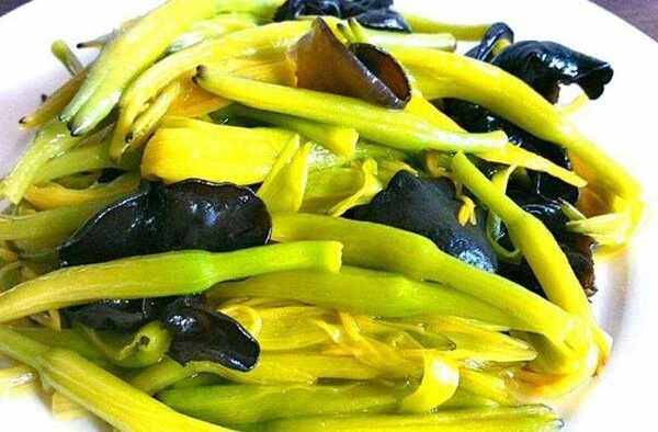 功效:木耳當中鐵元素的含量在眾多食物中是比較高的,除瞭可以改善缺鐵性貧血之外,對冠心病和血栓也都有一定的預防作用。同時木耳還可以促進腸胃的蠕動速度,加快食物的消化和吸收,對於減肥的人來說是一種不可多得的食物,另外木耳還具有清洗腸胃中雜粒的作用,而黃花菜當中的卵磷脂有促進大腦發育、提高記憶力的功效,同時還有美容養顏的功效。