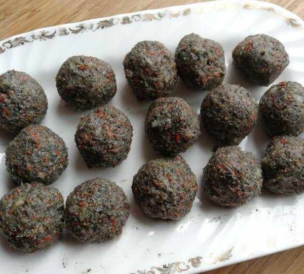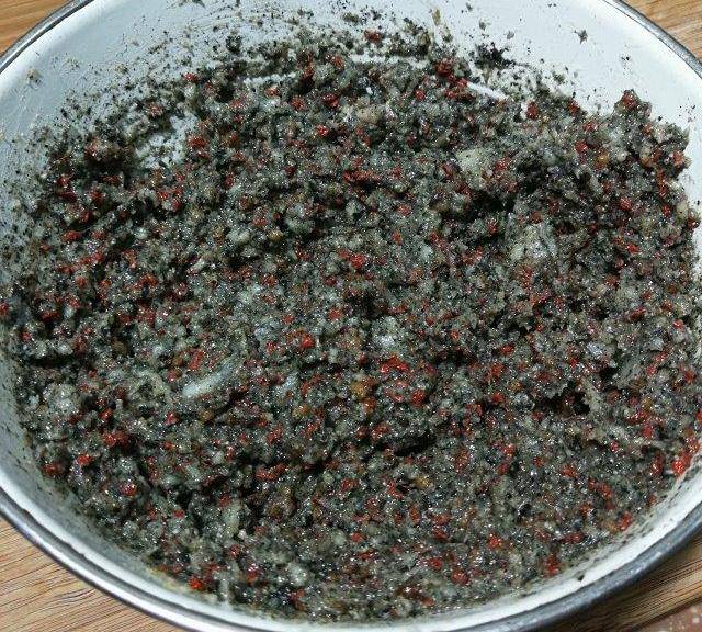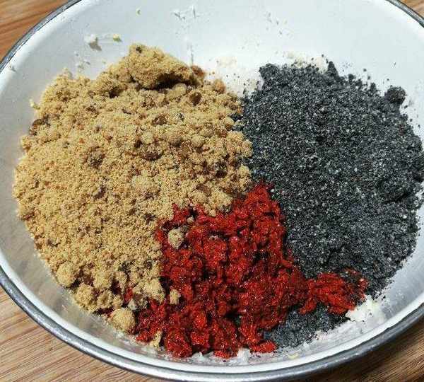 第2步、黑芝麻炒熟碾細,和紅糖、糖桂花一起放到肉餡中。