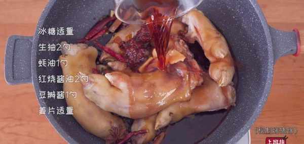 調料也要放足:冰糖適量、生抽2勺、蠔油1勺、紅燒醬油2勺、豆瓣醬1勺、薑片適量,還需要加入半瓶紅酒,再摻入開水到完全沒過豬蹄,用小火慢燉2個小時,用高壓鍋是40分鐘。