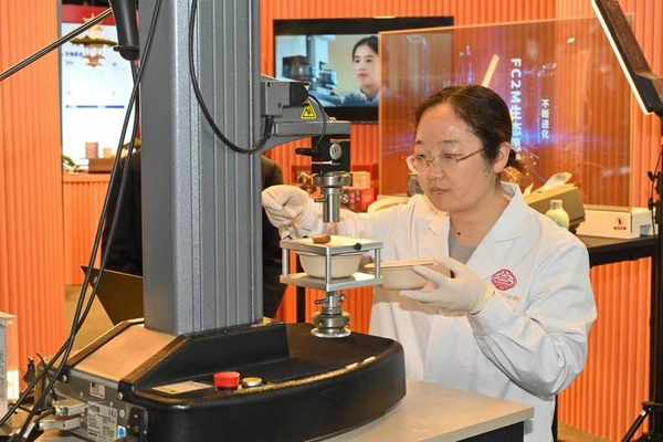 於2022年9月成立的豫園文化飲食集團科創中心帶來瞭老字號餐飲品牌佈局預制菜新賽道的研發“利器”——預制食品質構分析儀,現場展示如何檢測分析各類食品的酥爛、脆度、彈性等特質,精準的分析研究將更科學地賦能到產品研發與生產環節,保障預制菜產品的口感與質量。
