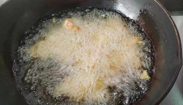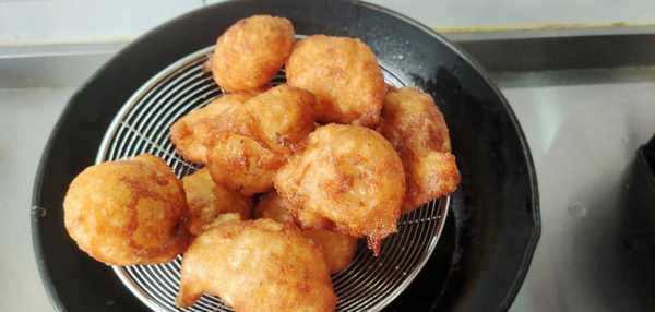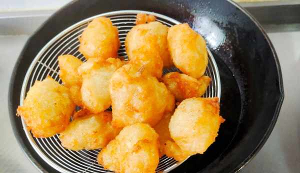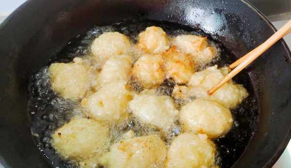 4、起鍋倒入多一點的花生油,燒至七成熱,然後,用一個勺子把面糊輕輕下入鍋中,這個時候一定要開中小火,等丸子完全下完再開入大火,慢慢炸至一面金黃再翻另一面繼續炸至就可以撈出控油開始瞭
