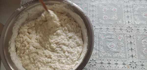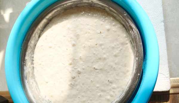 3、然後蓋上保鮮膜或鍋蓋,在溫暖處發酵半個小時以上,看到面裡面有氣泡,就說明發的已經差不多瞭