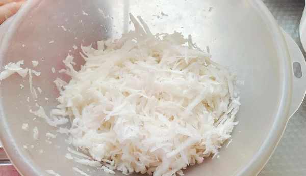 開始制作:1、把蘿卜擦成絲或者用刀切成絲都可以,不用放鹽,直接用開水燙一下,稍微攥一下水分備用