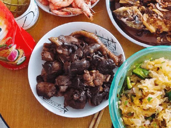 小土雞是前一天的,怕妹妹見血害怕。因為不知道妹妹具體早上幾點起床,哥哥做飯有點匆忙,花生米和水煮大蝦用的是簡單做法,過油炒一下,清水煮一下就上桌瞭。