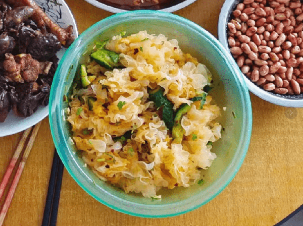 哥哥所做的菜中,能夠被妹妹稱為第三道大制作的,居然是黃瓜拌銀耳,妹妹最喜歡哥哥調配的涼拌汁,既不會過於酸甜,又十分爽口,辣度也是剛剛好,黃瓜為瞭保留口感,隻切瞭段,整道菜清脆爽口,妹妹在外面吃的都沒有這麼好吃。