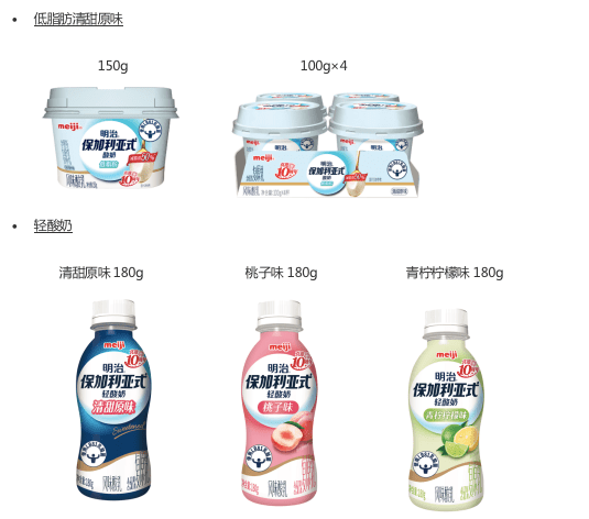 明治保加利亞式酸奶凝固型系列於2013年12月在中國上市,使用起源於保加利亞的LB81乳酸菌,通過乳酸菌的力量自然發酵凝固而成,口感濃厚順滑、入口即化。上市後以其獨特的口感迅速獲得瞭消費者的喜愛。2017年10月明治還推出瞭易於飲用及攜帶的瓶裝保加利亞式輕酸奶系列產品,同時也增加瞭多種口味,豐富瞭消費者的選擇,受到瞭廣泛好評。