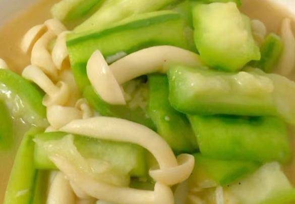 2、起鍋燒油,油熱後放入蒜末炒出香味,再放入絲瓜和白玉菇一起翻炒一會兒,炒至變色後,加入食鹽、胡椒粉、蠔油調味。