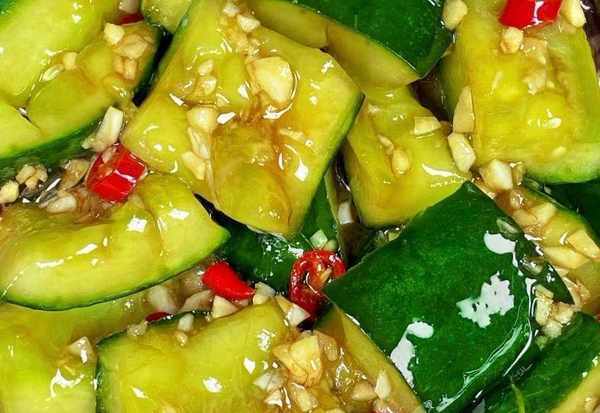 1、黃瓜用食鹽搓洗幹凈表面,再拍扁切成小段放入碗中。