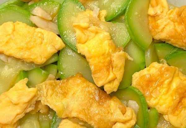 3、再次起鍋燒油,油熱後放入蒜末炒出香味,再放入絲瓜翻炒幾下,炒至變色炒軟後,放入雞蛋翻炒均勻。