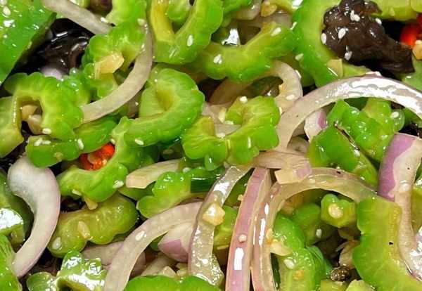 4、將洋蔥絲放入苦瓜木耳中,再倒入提前備好的涼拌醬汁,攪拌均勻即可上桌開吃。