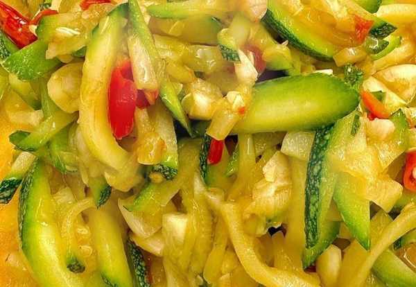 3、接著放入西葫蘆,加入食鹽、白糖、生抽調味,翻炒均勻入味,炒熟西葫蘆即可出鍋裝盤開吃。