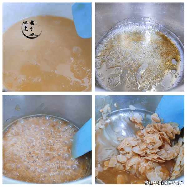 另起一鍋,倒入綿白糖和少許的水,熬出糖色後倒入前面煮好的麥芽糖漿,同樣也是邊煮邊攪拌,煮至冒泡後加入杏仁片繼續攪拌均勻。